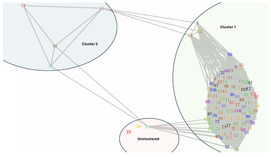 Since we need to flip the roles of the number of data points and the number of variables as a requirement of the betaMix model, we took n as the number of time points and the number of choice pairs as P such that and . Let be a function of the angle between two choice pairs in the network diagram. The correlation between two nodes (two BW choice pairs) is the same as the cosine value of the angle between two nodes. Therefore, we use as a manual tuning parameter for detecting an edge in the network diagram, which can hardly be found in other unsupervised network classification algorithms. We can fit the betaMix model by adjusting the correlation between two nodes, and we can use the decision parameter to detect an edge to the network diagram. The betaMix model can detect an edge from 0.76 to 1 for this data set (see Figure 3 and Figure 4). The correlation between two choice pairs is found to be significant with a value of 0.76 or more, e.g., the angle between the choice pairs is about 42 degrees or more. In Figure 3, The green line represents the input correlation of choice pairs, while the red line illustrates how well the fitted beta model captures this correlation.The orange region of Figure 4 shows the fitted range of for which choice pairs are correlated. The green curve represents the null distribution, while the blue curve depicts the fitted model, which closely aligns with the data. Figure 5 shows the network diagram of all the unique BW choice pairs. Cluster 1 has 101 nodes. Only four nodes (choice pair and 90) are classified in cluster 2. Choice pairs and 103 remain unclustered in the network diagram.