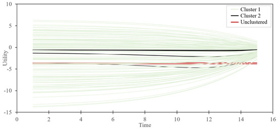 Utility–time curves for the nodes classified under cluster 2 and unclassified are shown in Figure 7. As in [5], the DP and LI attributes are favorably selected and attractive. Moreover, having the cluster is allowing us to confirm the indifference. Mainly, choices in the ensemble show that there is a lack of consistency in the choice behaviors as suggested in [5,42], where the sensitivity of the attribute was found as inconsistent in the data. To further the understanding, a comparison with the classical -means method is added next, which is followed by a discussion.