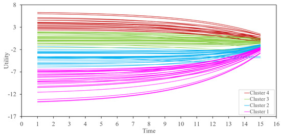 We used the -means classification method also to cluster all 108 choice pairs. We used the silhouette score to decide the optimal number of clusters. As we can see in Figure 8, the values and are good choices for the selected number of clusters. We can decide the best value for by examining the visualization of every instance’s silhouette coefficient, which is sorted by the cluster they are assigned to and by the value of the coefficient (see Figure 9). Based on the silhouette diagram in Figure 9, we can pick as the optimal number of clusters. See [43,44] for further explanation on clustering by silhouette coefficient. We plot all 108 utilities based on four clusters as shown in Figure 10.