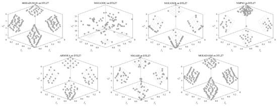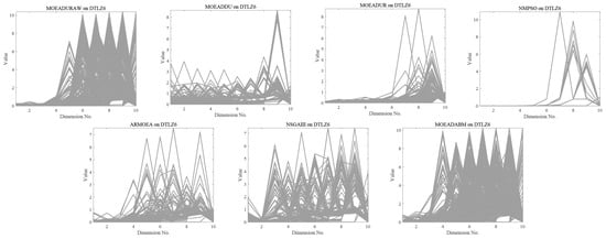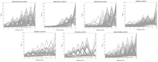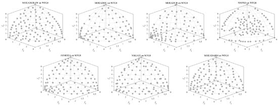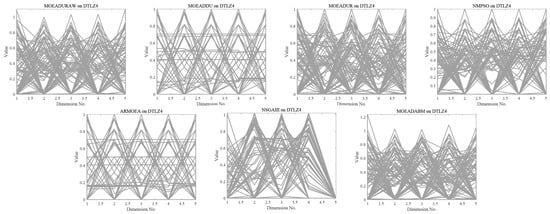 The computational complexity is considered for one generation of the proposed MOEA/D-ABM, whose computational cost mainly comes from the MOEA/D (Algorithm 2, lines 5–15), the update (Algorithm 2, line 16), the ABM, and the weight vector adjustment (Algorithm 2, line 25). The complexity of MOEA/D is ; the complexity of the update is ; the complexity of the weight vector adjustment is ; for the ABM, the complexity of initializing (Algorithm 5, line 1) is , and the maximum complexity of each auction round (Algorithm 5, lines 4-20) is (N bidders are unassigned and N auction items are bidded). The number of auction rounds, denoted as R, is finite but not fixed, primarily influenced by the relaxation parameter , the number of bidders N and the number of auction items ; thus, the complexity of ABM is . To sum up the findings, the maximum complexity of MOEA/D-ABM is .