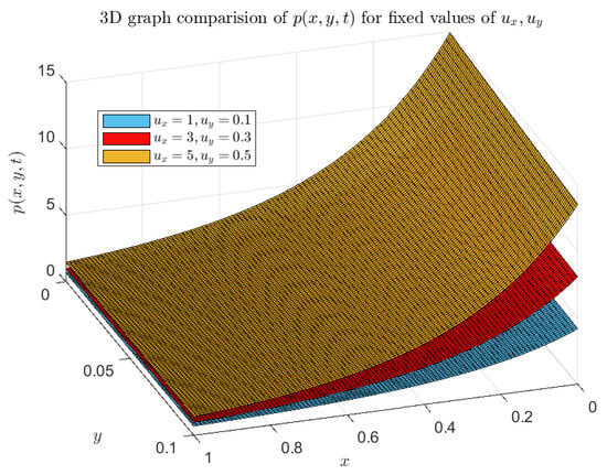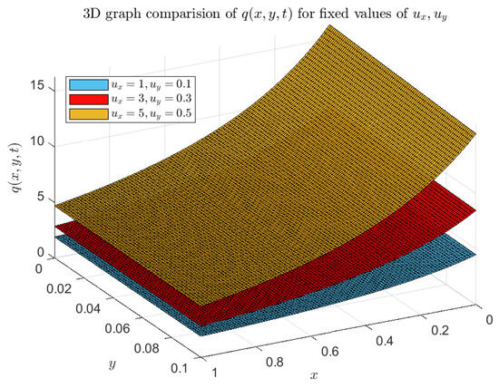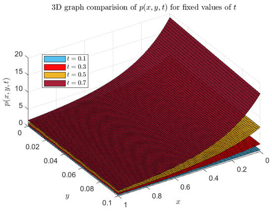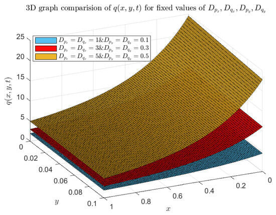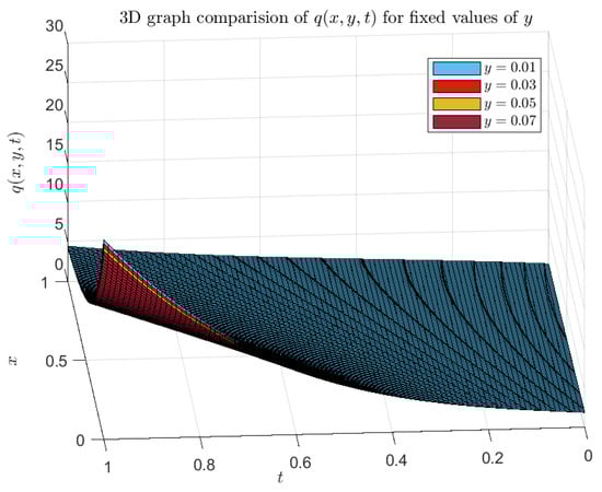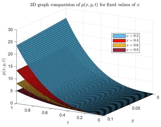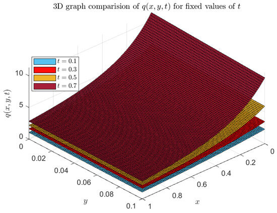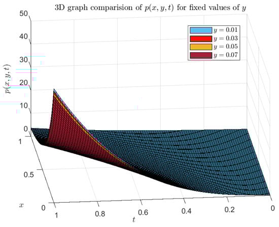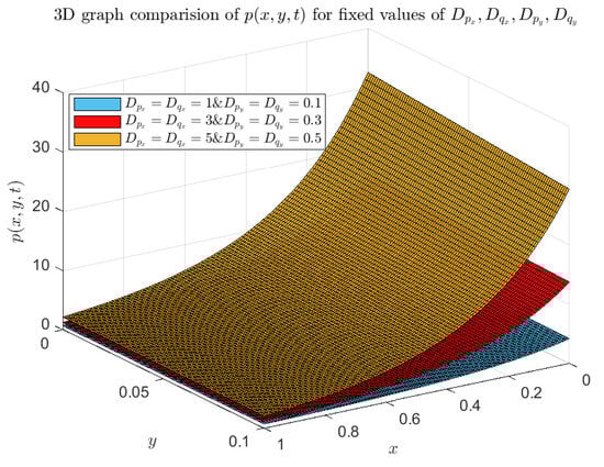 The numerical values of pollutant concentration for fixed are in Table 2 and Table 3. The numerical values of DO concentration for fixed , respectively, are given in Table 4 and Table 5. The impact of change in time on pollutant and DO concentration can be seen graphically in Figure 1 and Figure 2, respectively. The numerical values of p and q for fixed are given in Table 6, Table 7, Table 8 and Table 9. Figure 3 and Figure 4 give the three-dimensional graphical comparison of pollutant and DO concentration function for fixed x, respectively. The numerical values of p and q for fixed are given in Table 10, Table 11, Table 12 and Table 13. The impact of change in y on pollutant and DO concentration functions can be seen graphically in Figure 5 and Figure 6, respectively. It has been seen that the amount of pollution and DO concentration rises as t rises. And the levels of p and q decrease when x and y rise.