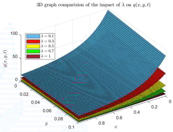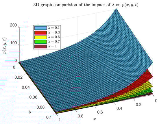 The numerical values of the pollutant and DO concentration for various values of () are provided in Table 16 and Table 17. The three-dimensional graphical comparison of p and q for various values of is shown in Figure 9 and Figure 10. If the values of are increased, then the values of p and q are raised.