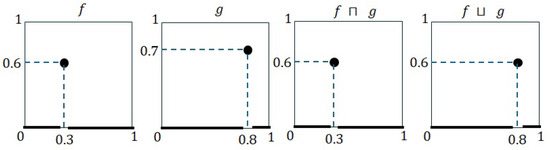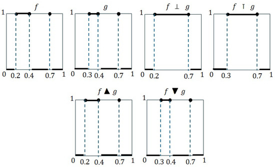 which clearly belong to and satisfy the conditions that and . Hence, it is clear that the recently introduced t-norm and t-conorm, represented by ⊤ and ⊥, are distinct from ⊓ and ⊔, respectively. Consequently, they are also different from ▲ and ▼, respectively.
