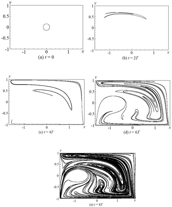 In order to numerically simulate the fluid advection process depicted in Figure 2e at , the following procedure was chosen. Let us fix the value , increase T from 0 to (corresponds to the value ), and monitor the advection process of the selected spot. This approach minimizes the accumulation of error. Consideration of the advection process during only one period T with a sufficiently large value leads to an erroneous result.