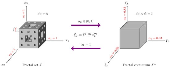 where ℓ denotes the lower cutoff of fractality and denotes the Hausdorff dimension in each fractional direction . Integer and fractal configurations are shown in Figure 1. The distance between the two points is given by , where , and the fractal continuum gradient , where are basis vectors and