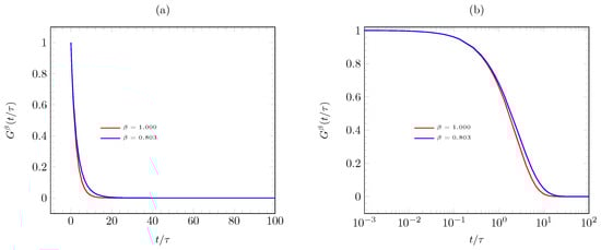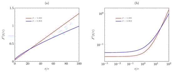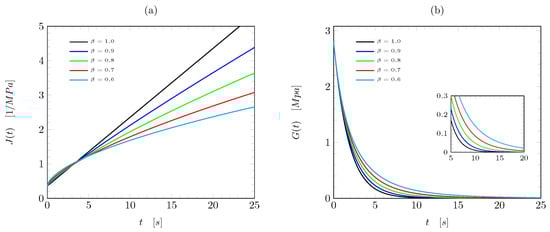 Predictions of fractal creep compliance for several beta values () for (a) creep modulus, and (b) relaxation compliance.
