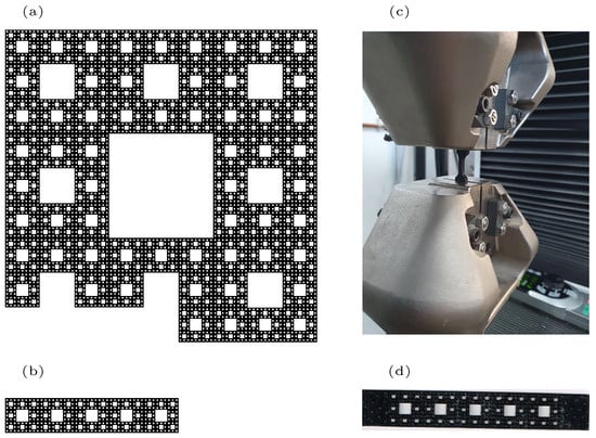 Sample with fractal geometry similar to the Sierpinski carpet : (a) fifth iteration for , (b) self-similar part of the Sierpinski carpet with five squares of third iteration, (c) the tensile test on a dog bone sample of the constituent material, and (d) the constituent material with the fractal domain.