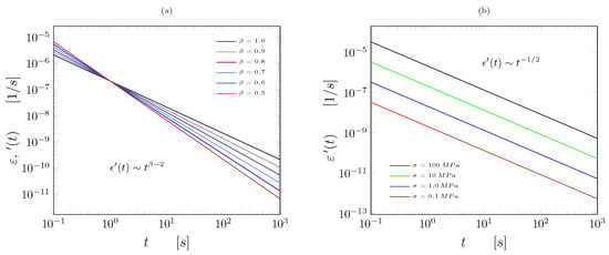 In the case of the creep strain rate in the fractal continuum space-time , we found a power law behavior for the variable-order of . The graph shown in Figure 6a was obtained by the least square method, where depends on the beta order, such that with a determination coefficient of . This results are in accordance with results given in [,]. However, the impact of fractality is observed, which depends on , and the slope is constant for a wide range of scales. On the other hand, the creep strain rate with respect to time for any applied stress behavior is also a power law but with the same stresses. Figure 6b shows the curves that show the behavior of for , where matches with the results reported by Liu et al. [].