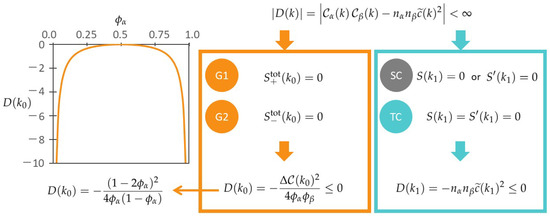 Figure 1 illustrates two cases where hyperuniform states emerge without divergence of while depicting the profile of given by Equation (40). Figure 1 summarizes that our general formulations verified at and , where the SFs equal zero due to the numerators instead of the denominators in Equations (16)–(19). The non-positivity conditions on reveal that uniform two-component systems are marginal or unstable at and . The encircled abbreviations, ‘SC’ and ‘TC’, denote single-component and two-component hyperuniformities, respectively, at . Meanwhile, ‘G1’ and ‘G2’ signify global hyperuniformities for (the sum of component densities) and (the density difference), respectively, at : . The orange curve depicts the relation (40) between and .