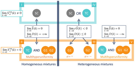 In Figure 2, the upper and lower states are colored blue and orange, respectively, to distinguish between them based on whether global hyperuniformity is preserved. The vertical thick line also separates the hyperuniform states into two groups depending on the sign of stability indicator in the zero-wavenumber limit. The left group satisfies the relation with , thereby ensuring homogeneity. The right group, on the other hand, considers mixtures in the region of , where homogeneous systems are unstable and tend to become heterogeneous, regardless of whether the inter-SF goes to zero in the zero-wavenumber limit or not. In Section 4.3, Section 4.4, Section 4.5 and Section 4.6, we will confirm the validity of relations for and given in the tentative classification flow of Figure 2.