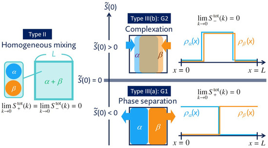 This section deals with Type-III systems that are globally hyperuniform despite violating the hyperuniformity of each component: either or holds though and/or (see Section 4.4 for details). Equation (10) implies that the positive intra-SF in total (i.e., ) is canceled by either the positive or negative value of intra-SF , representing a macroscopic correlation between different components. Equation (27) also reveals that G1- and G2-hyperuniformities are incompatible with each other as far as is non-zero. Figure 3 illustrates that phase separation and complexation are responsible for G1- and G2-hyperuniformities, respectively.
