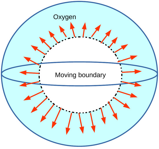 In response to the limitations of explicit schemes, several alternative methods have been proposed. Hansen and Hougaard [] introduced an integral equation approach, while Berger et al. [] employed truncation methods. Miller et al. [] and Liapis et al. [] advanced the field further by applying finite element techniques and orthogonal collocation methods to handle oxygen diffusion with more complex boundary conditions. Variational inequalities, introduced by Baiocchi and Pozzi [], provided another analytical framework, allowing for better handling of certain boundary conditions. Despite these advancements, computational challenges remain, particularly in accurately resolving the moving boundary’s dynamics near the sealed surface.