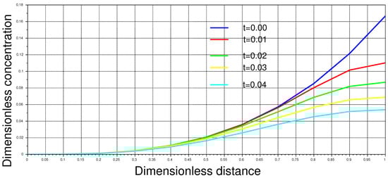 We compute from Equation (7) for various small time values, as shown in Table 1. The results demonstrate rapid convergence of the infinite series. Figure 3 presents the approximation derived from Equation (7), with representative curves illustrating the general shape and confirming that the concentration remains unchanged, within plotting accuracy, near the boundary at .