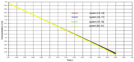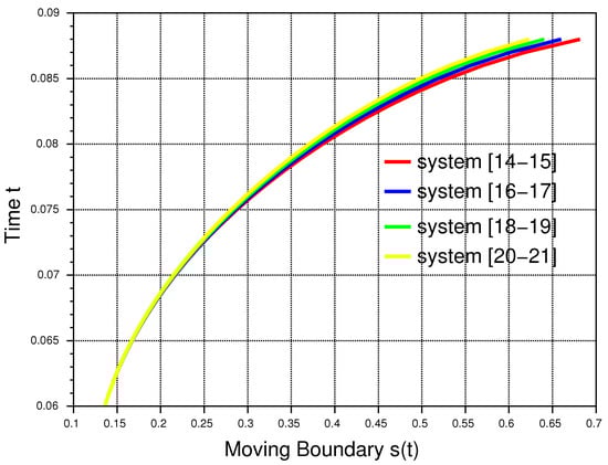 We tested various values of and s at a given t, using results obtained from the MG method. We found that condition (33)–(36) are only satisfied when . Therefore, to initiate the computations, we adopted values from the MG method at , specifically and ; see []. The simultaneous systems [(25)–(26)], [(27)–(28)], [(29)–(30)] and [(31)–(32)] were then solved using known methods with a time step . We used Scilab 2024.1.0, an open-source software for all the numerical calculations in our work. It is a reliable tool for solving differential equations and simulating complex systems. To ensure accuracy, We used small time steps and verified the results through convergence tests. We also found analytical solutions for short time intervals (as detailed in Table 1). The moving boundaries and the concentration variations at the fixed surface, as presented in Table 2 and Table 3, are shown as profiles in Figure 4 and Figure 5.