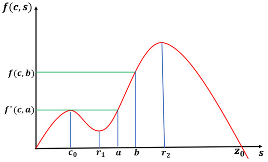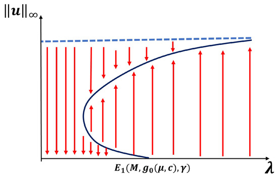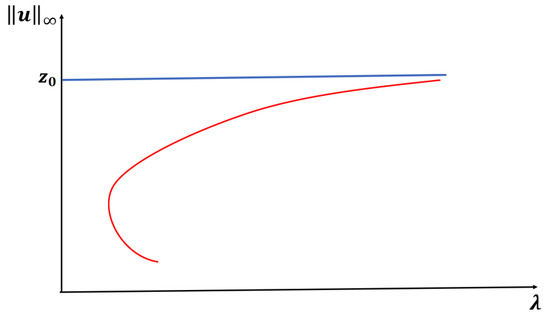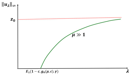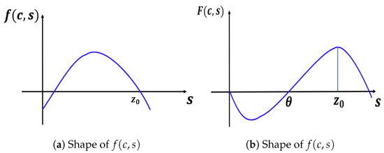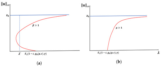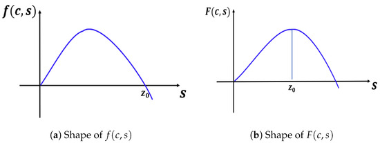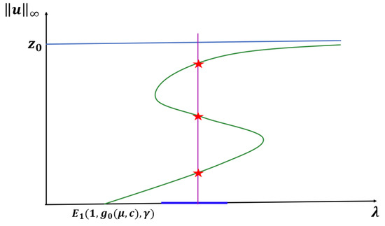 We note that when , our model has a semi-positone structure (see [29]), and for Lemma 3 to hold, the -value must be between and , where is the first positive zero of F and is the falling positive zero of f (see Figure 8).