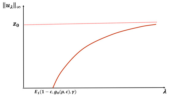 Let or and be fixed. Then, (1) has a unique positive solution for and no positive solution for . Further, as and as (see Figure 3).