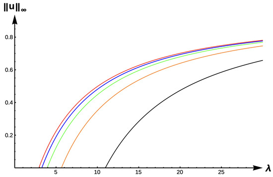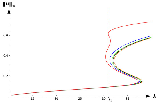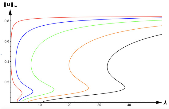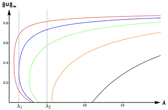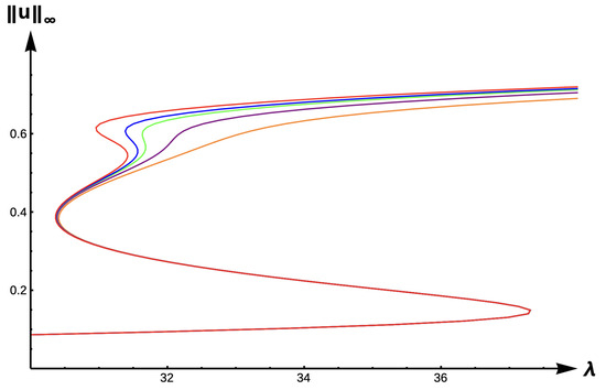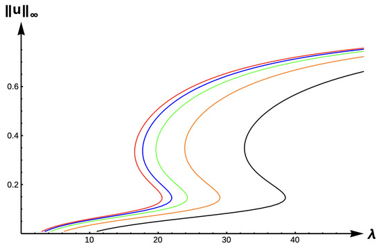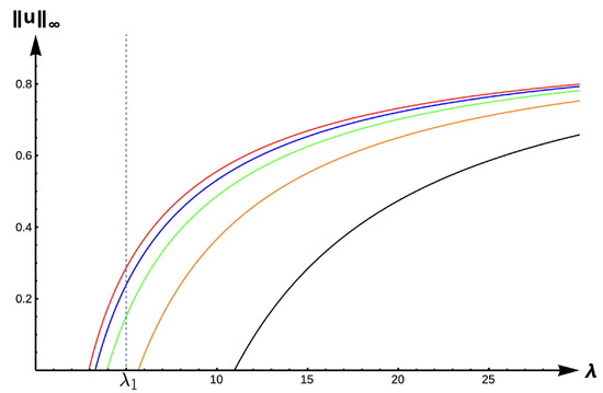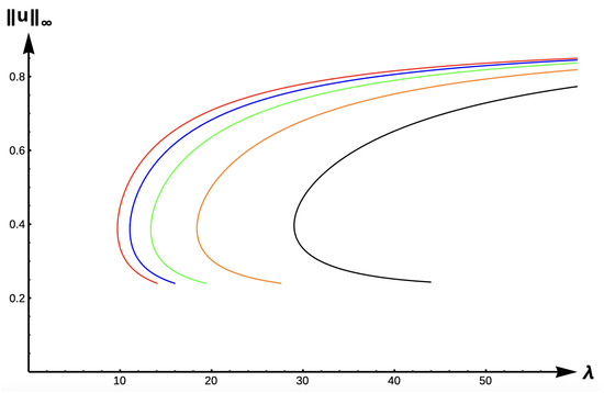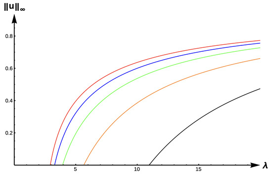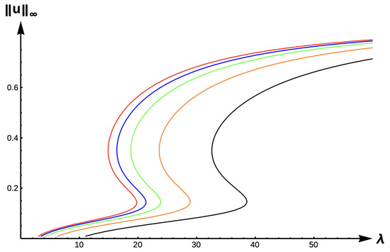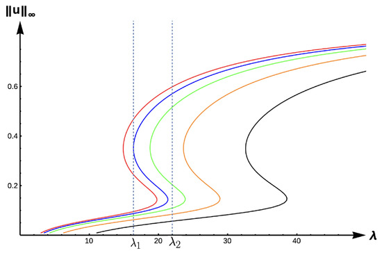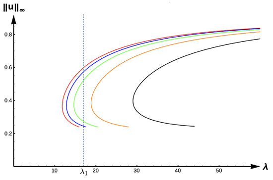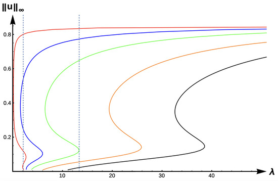 Bifurcation diagram of positive solutions for (7) with (DIE). Note that the dashed line is for , red represents , blue , green , orange , and black .