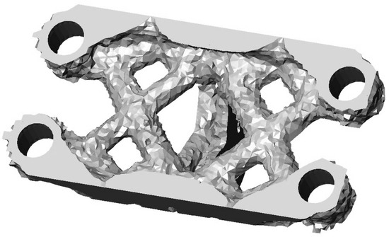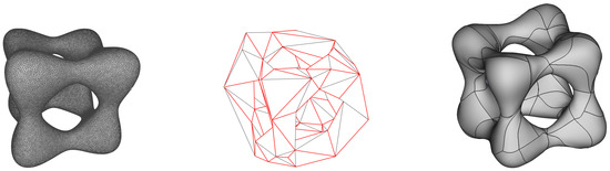 Figure 1 shows a typical triangular mesh from topology optimization. Such a mesh can be obtained using TO tools embedded in commercial CAD packages. Typically, it is a dense mesh made of several thousands of triangles, and the vertices are scattered irregularly; that is, they do not belong to a smooth surface. To improve the quality of this mesh, one may use smoothing methods such as [12,13,14,15,16]. However, those do not provide a mathematical representation of the surface, the features to be preserved can be affected, and the volume of the body can be altered. More specifically, smoothing tools do not produce a parametric surface but rearrange the position of the mesh vertices to reduce the noise and spikes. They output a triangulated surface which is adequate to prepare the path that the head of additive manufacturing machines should follow, or the movements required to lower the model once a layer has been completed, but cannot be edited using CAD software. Moreover, they often significantly alter the mesh’s dimensions and, due to their global nature, such methods can be inefficient or even unfeasible for large datasets. In general, smoothing methods do not reduce the size of complex meshes with millions of vertices, even in the case of flat surfaces, which only four vertices could represent. Those embedded in commercial CAD software (such as OptiStruct and SolidThinking by Altair Engineering and Tosca by Dassault Systemes) are more effective in handling complex datasets. Still, the codes and procedures are not available in the literature, and no details have been published.