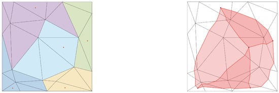 (Left): Partitioning of the TO mesh into tiles: each color identifies a different tile and the red dots correspond to the tiles’ site; (Right): An excerpt from the macro-triangulation obtained by connecting the tiles’ sites: the figure shows four macro-triangles colored in different shades of red. The red thick lines represent the macro-triangles “edges”, which are sequences of edges in the TO mesh.