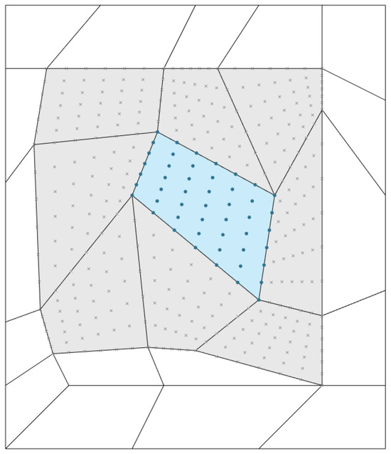 for some . The first term above minimizes the distance between the surface and the data points; the second term describes the bending energy of a thin plate, and thus its minimization promotes a smooth-looking solution. For each patch, the points are the vertices of the TO mesh inside the corresponding macro-quadrilateral (indicated in light-blue in Figure 6) and the adjacent ones (in grey in the same figure). The problem is solved by using a Local Multi-Step Algorithm, which undergoes three subsequent stages corresponding, respectively, to computing the control points close to the corners of the patch, those along the boundaries and finally the control points in the interior. Since we want to obtain a watertight (i.e., -continuous) connection between the spline patches, we additionally require that the control points of two B-spline surfaces along a shared boundary curve are equal.