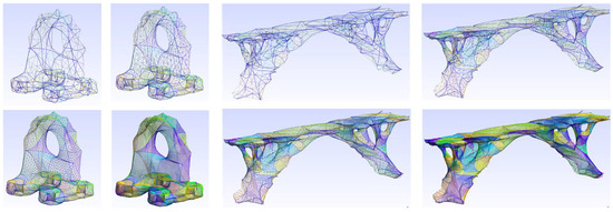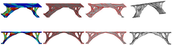 More recently, a new strategy was tested in [30], where a fully automatic process to convert 3D TO into CAD models is presented. Curve skeletonization and boundary triangulation are applied to obtain smooth shapes: Cross-sections are interpolated using cubic B-spline-based lofting functions to obtain 3D models with unchanged structural performances with respect to the original triangulation. This approach’s main limitation is that it can be applied only to cases where the output of TO can be approximated with beam-like structures.