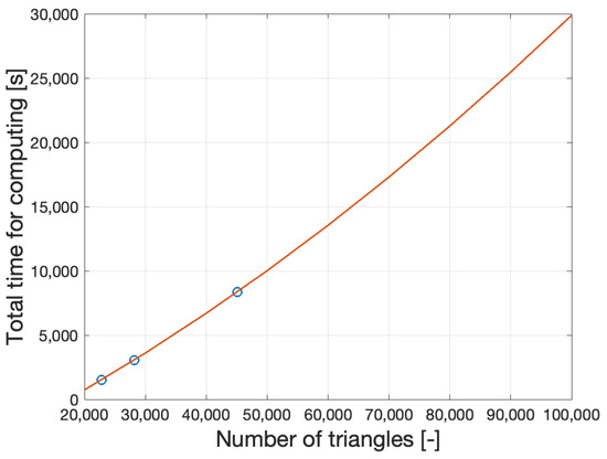 The graph in Figure 10 illustrates a curve that interpolates the computational times for the models tested in this study. It serves as an indication of the computational times one might expect for larger models (up to 100,000 triangles) using current hardware technology.