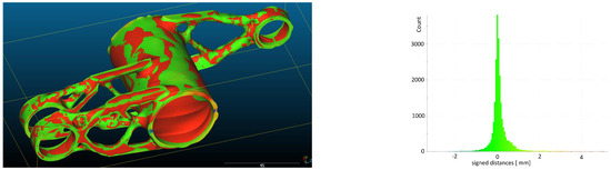 One of the issues that arise after transitioning from the TO mesh to a spline model pertains to structural behavior. Various smoothing and filtering techniques can deform the original body, leading to a reduction in volume and, consequently, a decrease in strength. This effect is evident when performing finite element analysis (FEM) on both the original and the smoothed/filtered bodies. To conduct a more detailed examination of how our approach affects material distribution, we performed a mesh comparison. We utilized the CloudCompare software, version 2.14.alpha (https://www.danielgm.net/cc/ (accessed on 31 December 2024)) to overlay the TO mesh and the spline model and employ the distance tool to identify and analyze the differences between them. The reference model for this comparison is the original TO mesh, so all differences are measured against it. Figure 11 Left illustrates the TO mesh in green and the spline model in red. Visually, a good matching of the two models can be noticed. The graph in Figure 11 Right is obtained from a distance analysis between them. The length (maximum dimension) of the bell crank is around 190 mm, and the mean distance between the models is 0.098 mm.