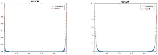 Exact and numerical solutions of Example 3 (left) and Example 4 (right) obtained with QBSCM for with