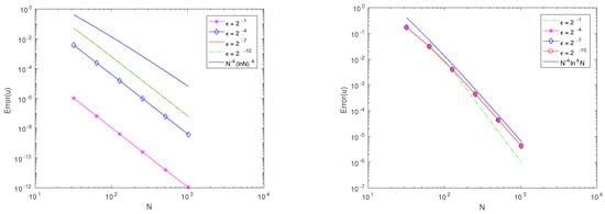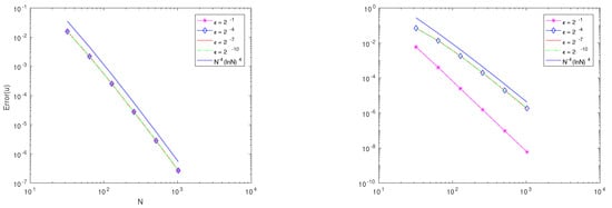 Let be a numerical approximation of the exact solution u on the mesh where N is the number of mesh subintervals. For a finite set of values , we compute the maximum pointwise errors [26] by