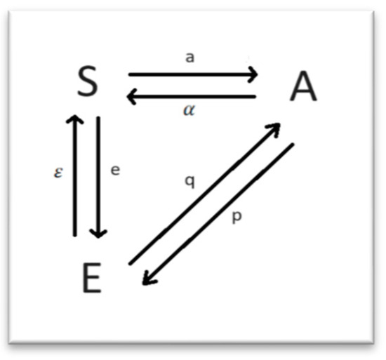 Let denote the proportion of the total population susceptible at time t, the proportion of altruistic individuals at time t and the proportion of selfish individuals at time t. When a susceptible individual meets an altruistic one, there is a probability that he becomes an altruist himself. However, there is a certain probability that he will not maintain this attitude forever, and he will lose this acquired character and become susceptible again. The same can occur in the case of a susceptible individual meeting a selfish one. When an altruist meets a selfish individual, he can become selfish himself with a certain probability, or vice versa. The test model is represented in a diagram figure (Figure 1).