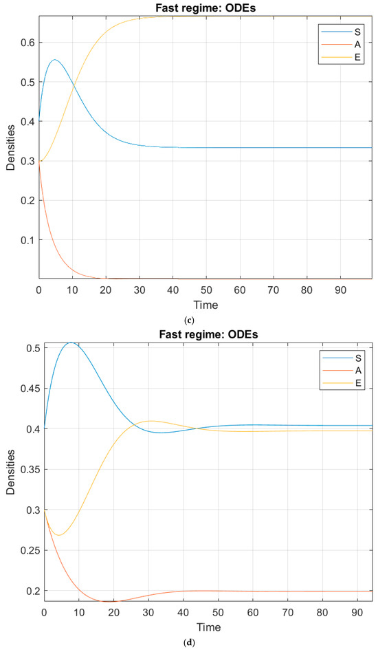 Plots of the solution state vector (time in days in the horizontal axis; units, in proportions, called densities in the vertical axis) of the model (1) for different parameter values: (a) ordinary case with a = 0.4, e = 0.3, α = 0.5, ε = 0.35, p = 0.2, q = 0.8, (b) case more inclined to altruism with a = 0.4, e = 0.1, α = 0.3, ε = 0.5, p = 0.2, q = 0.8, (c) case more inclined to selfishness with a = 0.4, e = 0.3, α = 0.5, ε = 0.1, p = 0.7, q = 0.8, (d) balanced case among the proportions of the three different types with a = 0.4, e = 0.3, α = 0.4, ε = 0.002, p = 0.2, q = 0.8. The initial state vector is (S0, A0, E0) = (0.4, 0.3, 0.3).