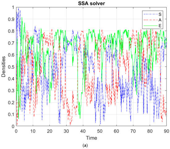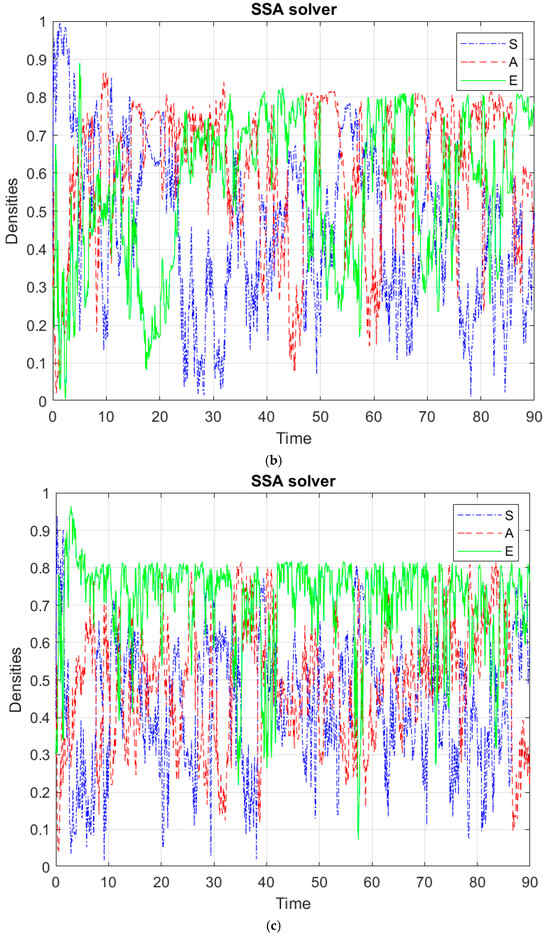 If we apply the backward technique to the ODEs model (1), we obtain the discrete stochastic system (7) and (8) and SODE equation (9), whose exact solution can be computed via the SSA and the explicit Euler method to simulate the system [20]. We used a modified version of Gillespie’s SSA, working with a sorting algorithm to choose the firing reaction at each step. One would expect that the dynamics of the discrete stochastic system (8) and (9) have the same behavior as the continuous deterministic case. In Figure 3, we show these solutions associated with the continuous case through the backward technique. In a deterministic setting, we obtain the boundary equilibrium (1, 0, 0), the altruistic equilibrium, the egoistic equilibrium and the endemic (positive) equilibrium (where are stable points for the choice of the parameter values (Appendix A). In a discrete stochastic setting, instead, for each kind of equilibrium, the numerical simulations do not show the existence of the same stable equilibrium as in the deterministic case. For example, the stochastic case for the scenario of the boundary susceptible equilibrium is not preserved: there are quite noticeable fluctuations for the selfish proportion, which often exceeds the susceptible proportion (Figure 3a). Moreover, the discrete stochastic case for the altruistic equilibrium scenario shows a kind of alternation of the altruistic and the selfish proportion (Figure 3b). Furthermore, the discrete stochastic case for the egoistic equilibrium scenario shows values for the proportion of selfish higher than altruists and susceptible, allowing the proportion of altruists to oscillate between non-negligible values (Figure 3c). Finally, the discrete stochastic case for the endemic equilibrium shows a kind of egoistic equilibrium (Figure 3d) or supremacy for the selfish proportion. We summarize the above results in Table 1. This different behavior of the system shows that intrinsic noise significantly modifies the dynamics of the system observed in the deterministic case. In the discrete stochastic case, due to intrinsic noise, not even the scenario of the positive equilibrium is preserved. Maybe in the discrete stochastic case, we can reasonably say that none of the three personality types is left to fade away. It is worth noticing that the discrete stochastic system (8) and (9) shows a much weaker dependence on the parameter values than the ODE system does. Different models other than (1) show a similar discrepancy effect, yielding different dynamics of the systems in stochastic discrete settings and in the deterministic continuous regime [19].