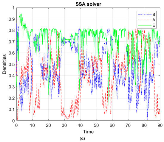 Plots of one path of the solution state vector (time in days in the horizontal axis; units, in proportions, called densities in the vertical axis) of the model (8) and (9), describing the discrete stochastic model involving demographic noise. The parameter values are: (a) a = 0.4, e = 0.3, α = 0.5, ε = 0.35, p = 0.2, q = 0.8; (b) a = 0.4, e = 0.1, α = 0.3, ε = 0.5, p = 0.2, q = 0.8; (c) a = 0.4, e = 0.3, α = 0.5, ε = 0.1, p = 0.7, q = 0.8; (d) a = 0.4, e = 0.3, α = 0.4, ε = 0.002, p = 0.2, q = 0.8. The modified SSA is used. The initial state vector is (S0, A0, E0) = (0.4, 0.3, 0.3).