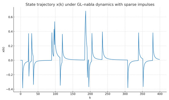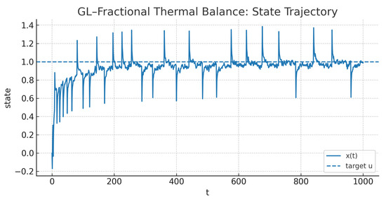 State trajectory under GL memory (): vs. setpoint u . Bursts perturb the path but do not destroy fuzzy statistical convergence.