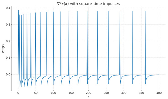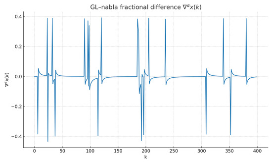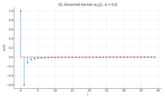 Finally, Figure 7 depicts the Grünwald–Letnikov binomial kernel for , highlighting the long-memory effect via slowly decaying magnitudes and sign alternation.