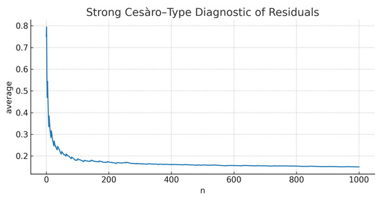 Figure 8 shows tracking u despite bursts. Figure 9 and Figure 10 depict and ; bursts create visible spikes yet are sparse. Figure 11 plots the running fraction of violations , which decays towards 0, confirming the fuzzy statistical smallness of the residuals. Finally, Figure 12 reports the strong Cesàro-type average , which also tends to 0, aligning with Theorem 9.