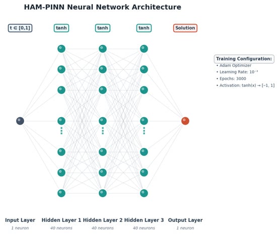 The neural network of HAM-PINN is a fully connected feed-forward network (Figure 2). The network consists of a single input layer, three hidden layers, and one output layer. In the input layer, there is only a single neuron, which takes the independent variable t from . In the three hidden layers, there are 40 neurons, which are passed through the hyperbolic tangent activation function, which normalizes the output to the range . The final layer is the output layer with the single neuron, which approximates the overall solution. To optimize the parameters, we use the Adam optimizer with an initial learning rate of , and the model is trained for a total of 3000 epochs.