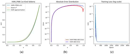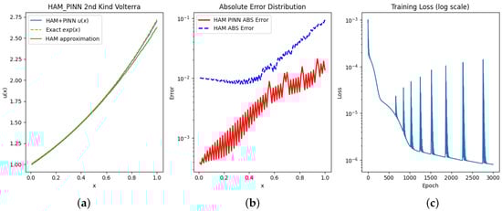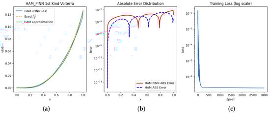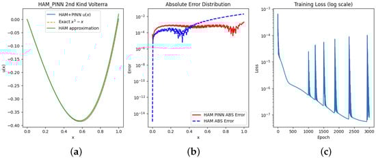 where the exact solution is given by . This equation is characterized by a linear structure and a discontinuous kernel. To solve this problem, we applied a hybrid approach combining the PINN method with the HAM, using and training the neural networks up to 3000 epochs.