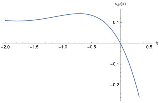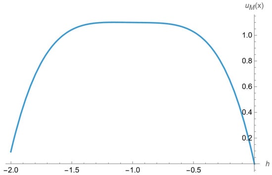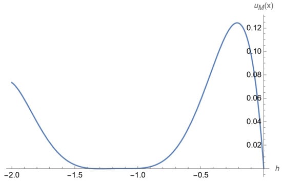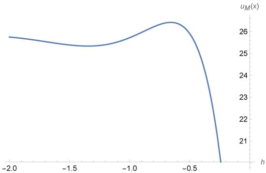 Figure 4 illustrates the convergence region of the auxiliary parameter ℏ, which plays a crucial role in ensuring the validity of the HAM. By plotting the so-called ℏ-curves, we are able to identify the intervals where the approximate solution converges to the exact one. For this particular example, the convergence region is observed within the interval . Inside this range, the series solution generated by the HAM remains stable and reliable, whereas values of ℏ outside this interval lead to divergence or loss of accuracy. This clearly demonstrates the importance of the convergence-control parameter in the HAM, since it not only guarantees convergence but also provides flexibility in adjusting the solution process without altering the original problem formulation.