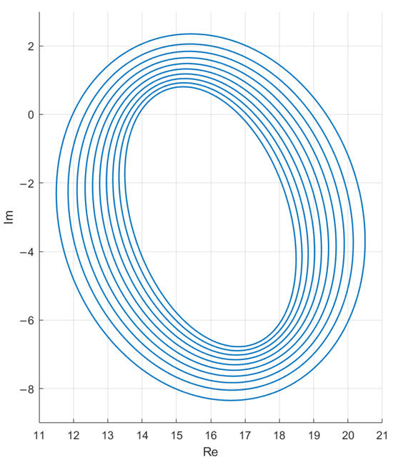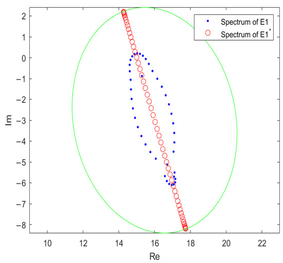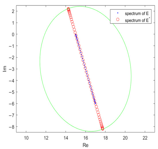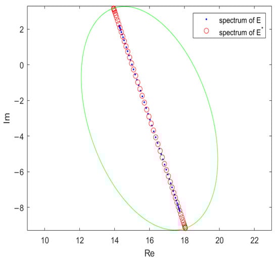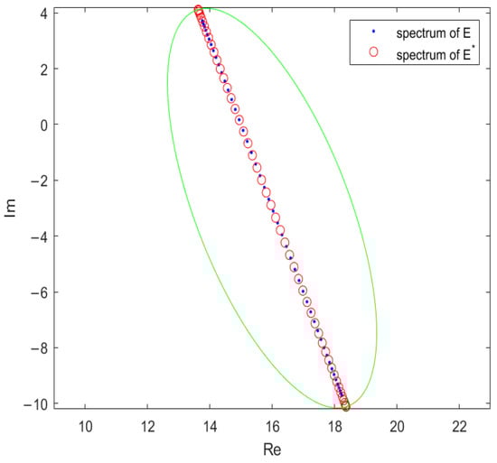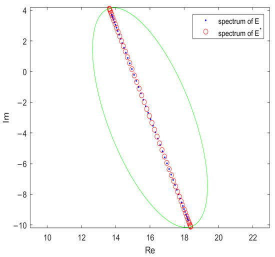 with , where g is the ratio in (10). It is observed that is defective, while is normal. The eigenvalues of and are visualized in Figure 1, Figure 2, Figure 3 and Figure 4, where horizontal and vertical axes represent the real and imaginary parts of eigenvalues, respectively. The eigenvalues are determined by resorting to Equations (5) and (6). The figures depict the image of the unit circle under the matrices , and the detailed information can be referred to in Equation (29). Figure 5 demonstrates the spectra of the matrices and obtained by executing the QR algorithm. In the first five figures, each green elliptical curve is the spectral boundary of