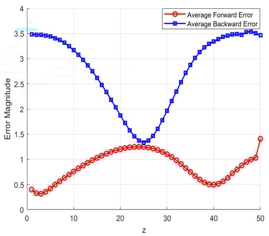 The variation of the average forward and backward errors of at g = 0.1 with matrix dimension z. Red circles represent the average forward error, and blue squares represent the average backward error.