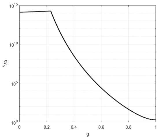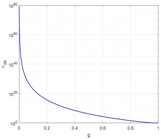 Logarithmic plot of the condition number () versus the parameter g for and .