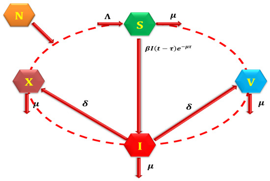 In this part, the dynamics of the cervical cancer epidemic (CCE) due to human papillomavirus (HPV) infection are introduced. The variables , and represent the numbers of susceptible females, females infected with HPV, females infected with HPV but not yet affected by CCE, and females infected with HPV and affected by CCE, respectively. The order of compartments in the CCE model is presented in Figure 1, where N denotes the total number of women, represents the probability of infection with HPV, represents the probability that she will have cervical cancer, and represent the birth rate and mortality rate of the human population, respectively. The normalized model is obtained by considering . One of the state variables, X or V, can be canceled out because of the no-coupling effect, as shown by the block diagram in Figure 1. In this model, the parameter represents the effective contact rate leading to HPV transmission. It captures the likelihood that a susceptible individual becomes infected after contact with an infectious person. We assume a constant across all transitions involving infection (i.e., contacts with individuals in compartments , or V). This simplification allows the model to focus on the effects of delay, stochasticity, and fractional order without introducing excessive complexity. However, we recognize that in real-world scenarios, the transmission rate may differ between early-stage infection I, latent carriers X, and individuals with cervical cancer V due to variations in viral shedding or behavior.