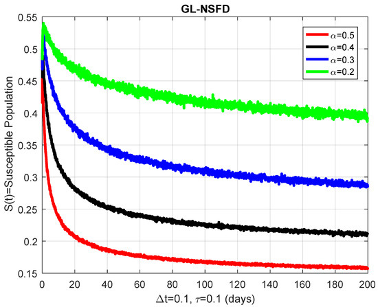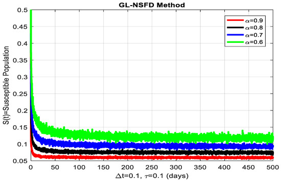 Graphical illustration of the susceptible population for different fractional-order values and .