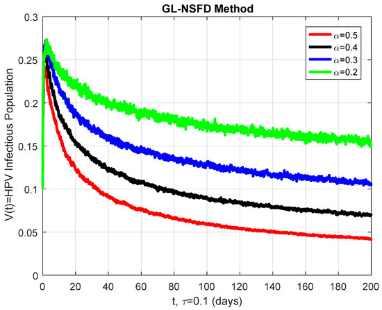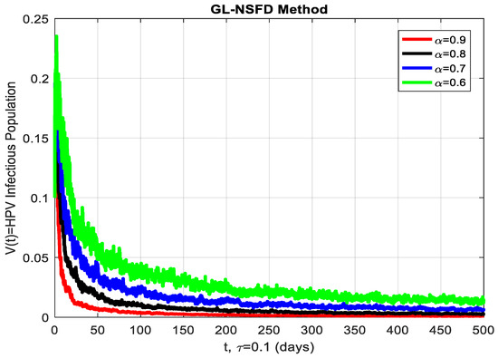 The graphical discussion for human papillomavirus (HPV) addresses the dynamics of disease evolution under varying values of the fractional order , which influence the behavior of the model compartments under time-delay effects. Figure 3 and Figure 6 demonstrate that the decay in the susceptible population is slower for smaller fractional orders, meaning susceptibility lasts longer due to delays in disease progression or heterogeneity in exposure. Conversely, higher fractional orders yield a quicker reduction, closely resembling classical integer-order models in which exposure is uniform and immediate. This behavior highlights the significance of incorporating fractional dynamics to capture real-world features like immunity variability and time-lagged immune responses. It also underlines the value of early intervention strategies, such as vaccination, to reduce the long-term size of the susceptible population. Figure 4 and Figure 7 show that for lower values of , the infected population peaks later and more extensively, indicating slower transmission and prolonged infections. In contrast, higher values produce earlier and sharper peaks, signifying faster infection cycles. These observations support the conclusion that fractional-order models better accommodate diseases with latency and memory characteristics, such as HPV. From a public health perspective, such insights are crucial. Lower values suggest the importance of sustained treatment programs, while higher values call for rapid outbreak response strategies. Lastly, Figure 5 and Figure 8 reveal that the infectious population increases gradually and stabilizes later when is small, illustrating delayed transmission and extended infectious periods. In contrast, higher orders show a rapid increase followed by quick stabilization, reflecting more aggressive disease spread and faster recovery. Overall, these results demonstrate that fractional-order modeling—particularly when implemented with a stable scheme like GL-NSFD—offers a powerful framework for realistically simulating complex diseases like HPV. The findings are essential for tailoring interventions to match either slow-progressing or fast-spreading disease dynamics.