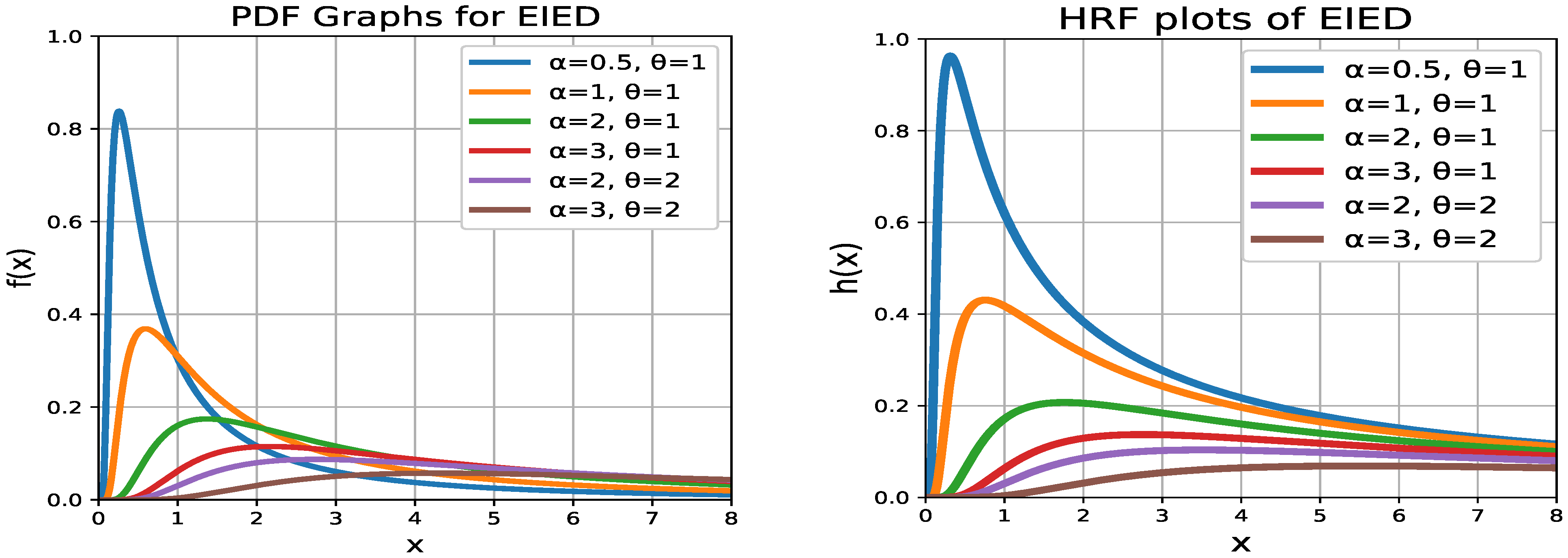 - EIED is a flexible extension of IE. The new shape parameter “stretches” the baseline IE distribution. When , it reduces to the standard IE. For , the PDF shifts to the right, with the peak becoming lower and wider, allocating more probability mass to a larger x. Conversely, when , the PDF becomes more concentrated near zero, producing a higher, sharper peak.