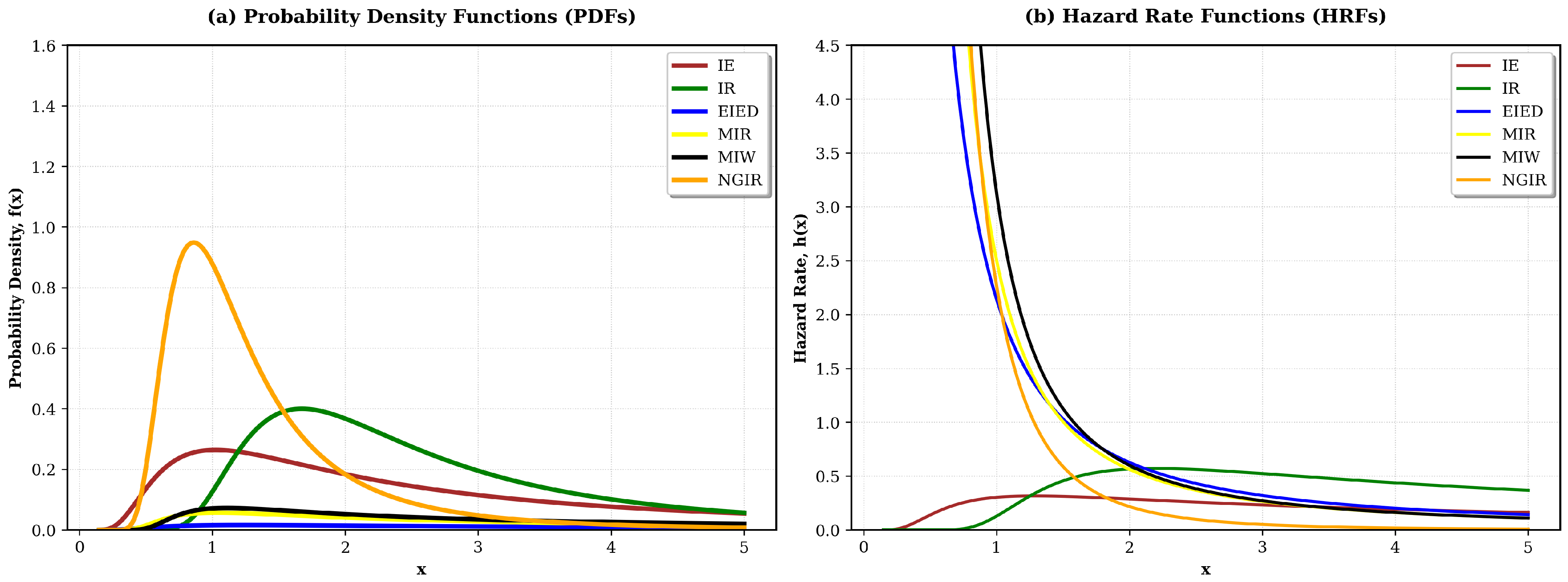 - The key innovation of NGIR is its additive structure in the exponent: . This form allows it to blend characteristics of the IE and IR families seamlessly. The parameter acts as an exponentiation parameter, adding flexibility around this new baseline. The distribution can mimic IE (by setting ), MIR (by setting ), or any hybrid thereof, resulting in a highly versatile range of shapes.
