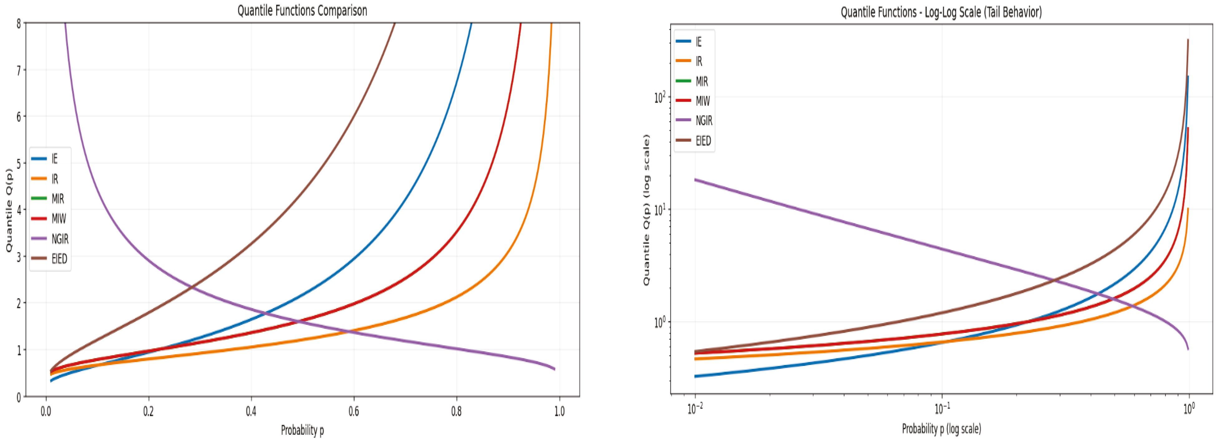 - Tail behavior of inverse distributions: However, not all inverse distributions have tails of equal heaviness. The “weight” of the tail is determined by the rate of polynomial decay: distributions such as IE, EIED, and NGIR exhibit the heaviest tails, as their survival functions decay at the slowest rate, with . Lighter yet still heavy tails are observed in the IR and MIR distributions, where the survival function decays as . Consequently, an extreme value is less likely to be observed from an IR distribution than from an IE distribution with a comparable scale.