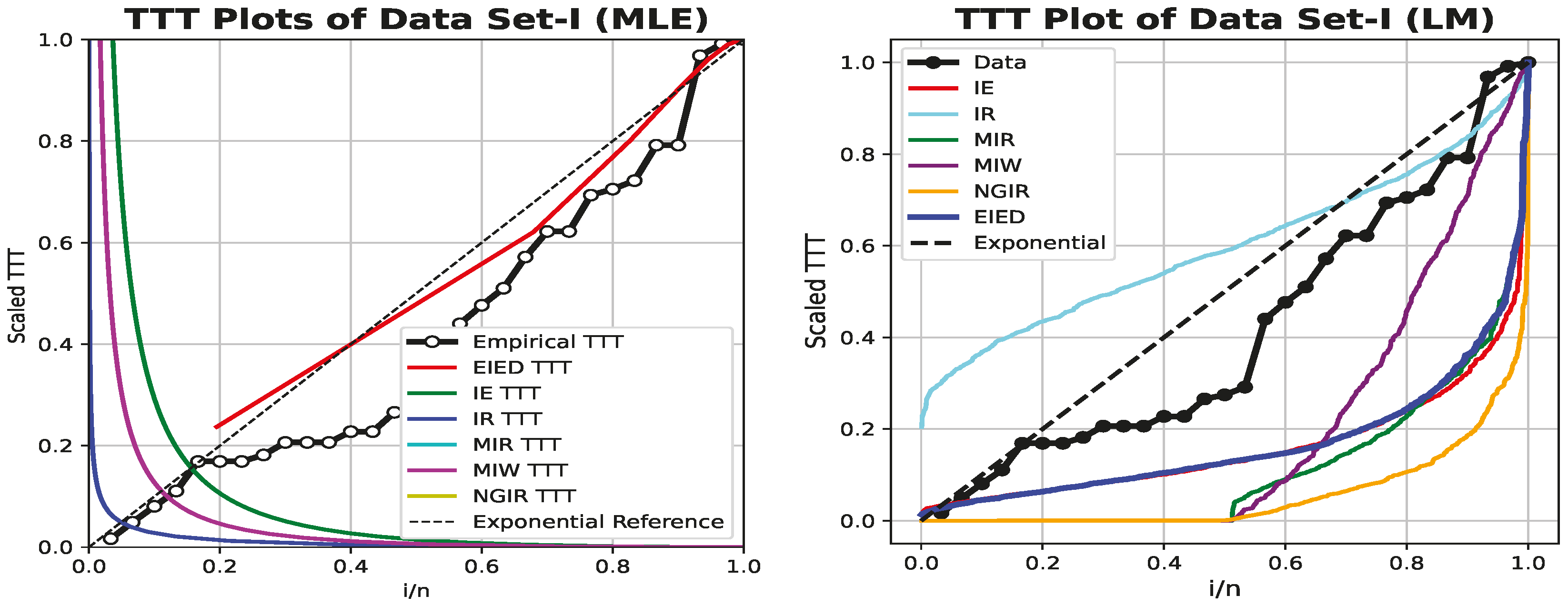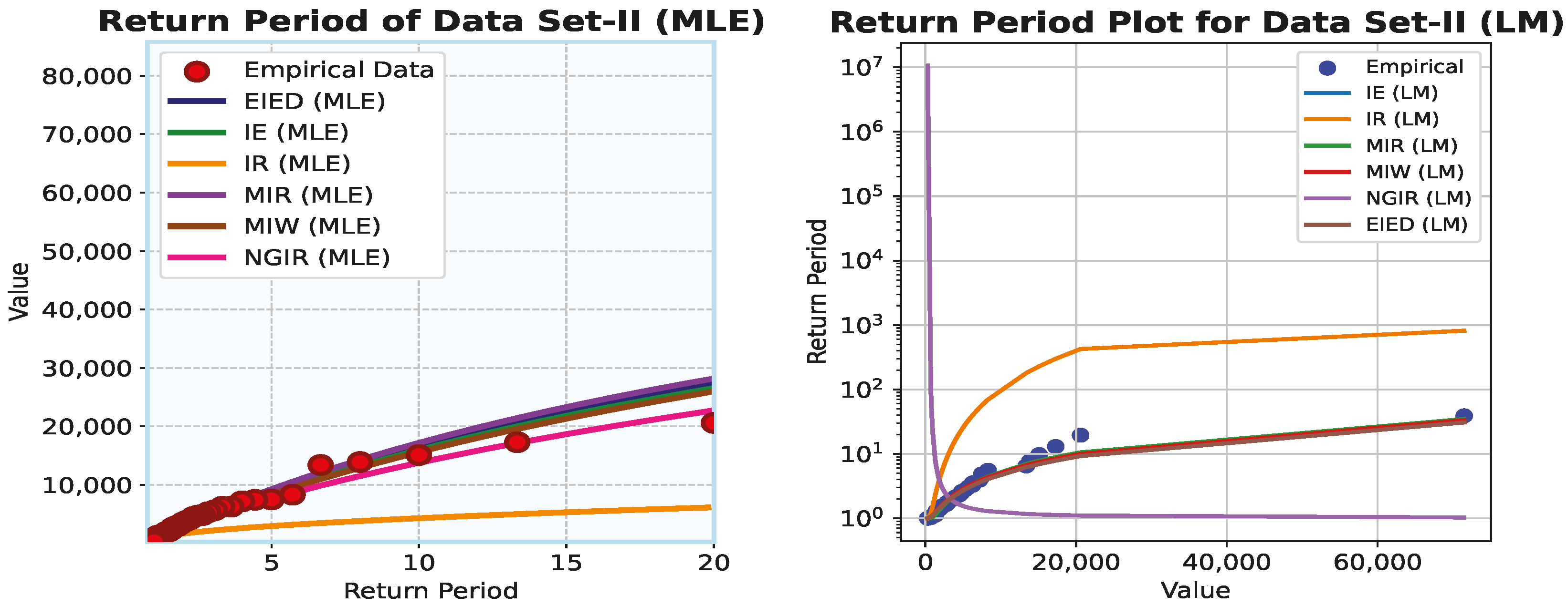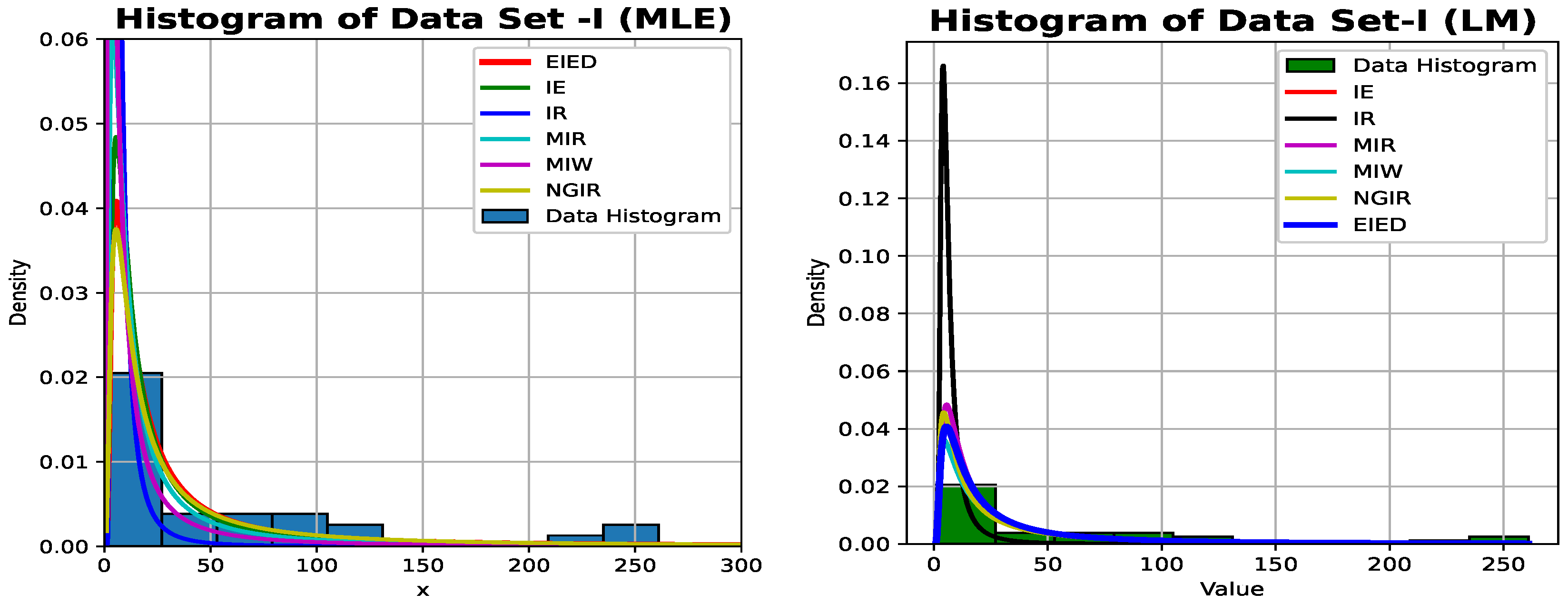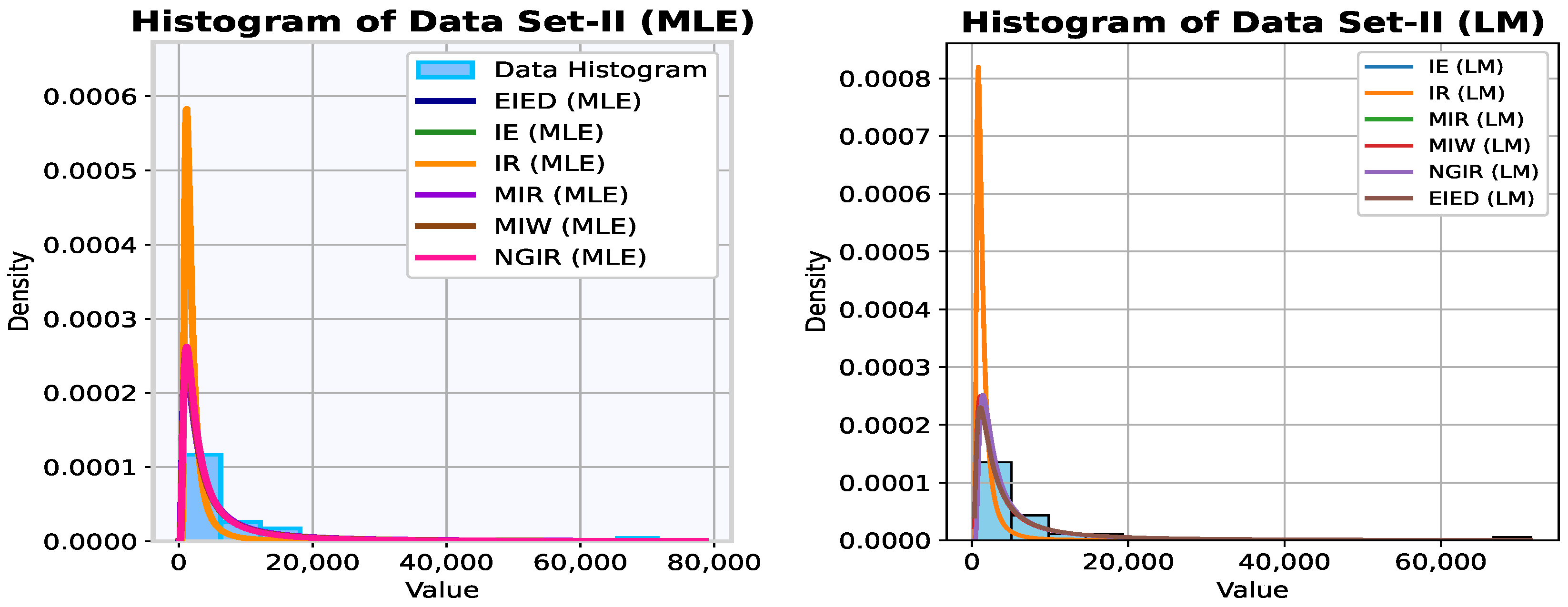 - Tail weight hierarchy: The MIW distribution is unique in allowing the tail weight to be tuned via its shape parameter . Depending on , its tail can be heavier than IR (), similar to IR (), or lighter () while still belonging to the heavy-tailed family. For example, when , the survival function behaves as , making its tail lighter than that of IR but still heavier than any exponential-tailed distribution. So, the hierarchy of tail weight among these heavy-tailed models generally follows IE, EIED, NGIR > MIW with IR, MIR > MIW with .