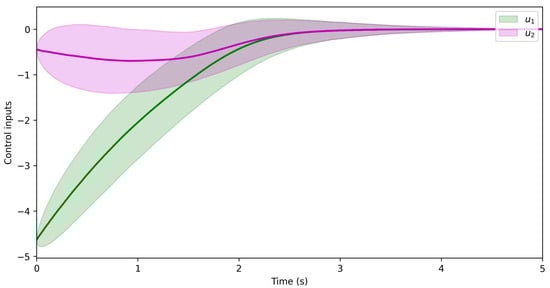 For and , Figure 1 and Figure 2 show the mean along with one standard deviation (shaded area) of the closed-loop system states along with the control inputs for sample paths.